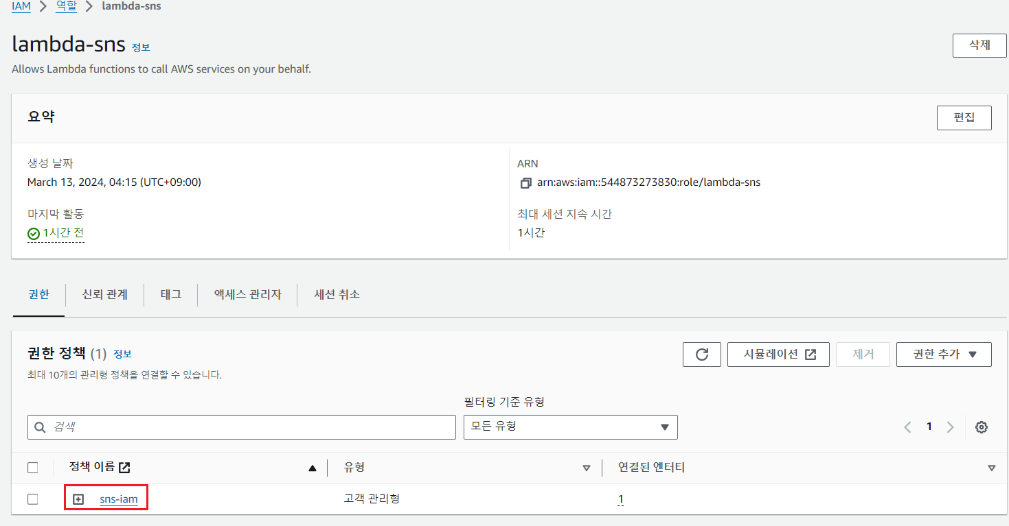 먼저 Lambda 함수에서 S3와 SNS에 대해 읽기/쓰기 권한이 있어야 하기 때문에 정책을 추가해 준다.