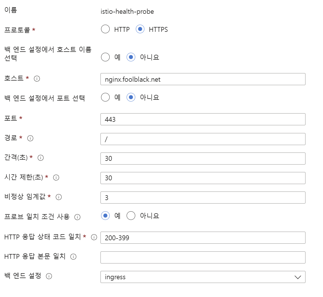 - 백엔드 풀은 Ingress External ip로 설정
