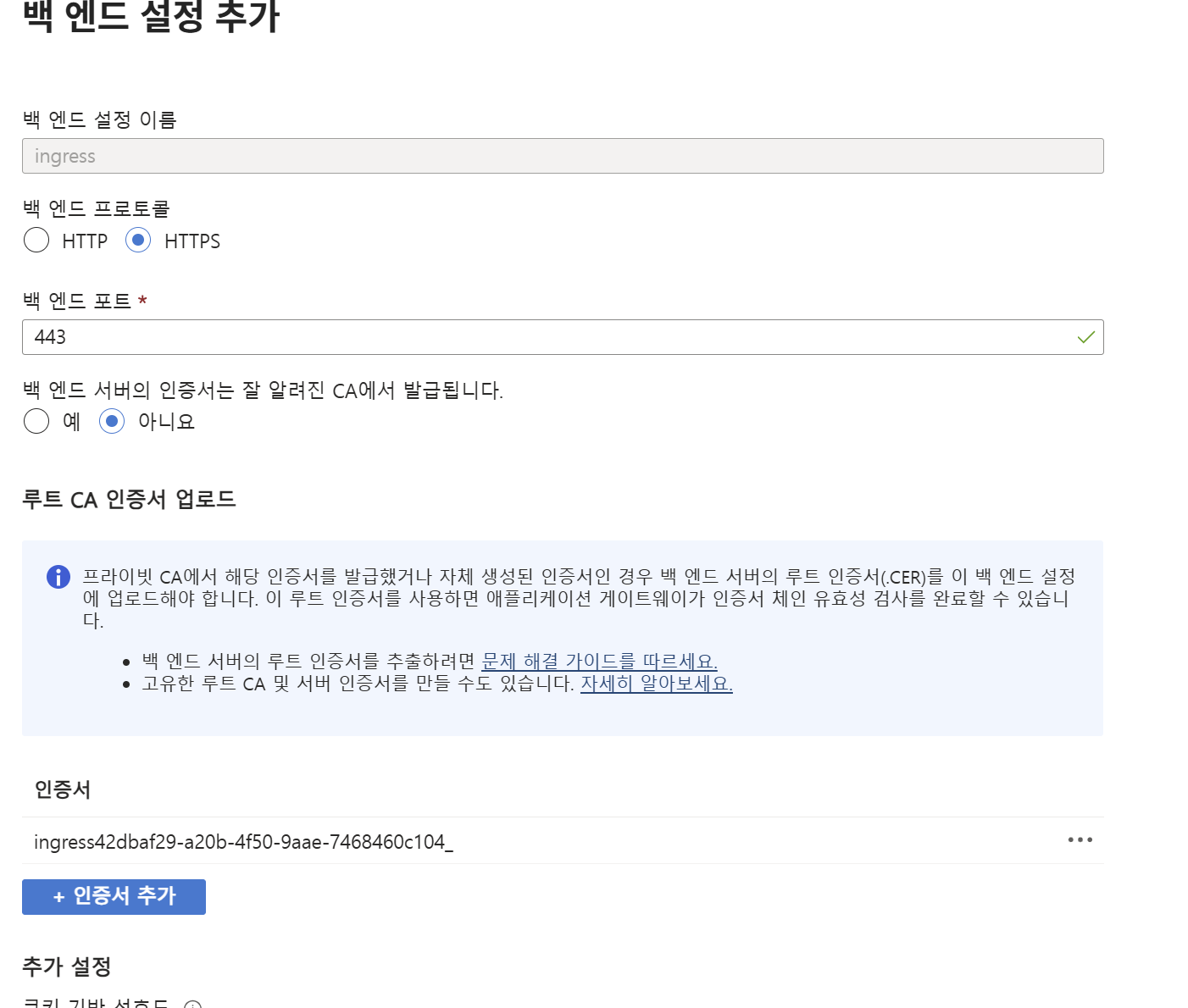 백엔드 설정 부분인데 공인 CA인 경우에는 그냥 '예' 로만 하면 되지만 본인은 Openssl로 사설 CA로 발급받았기 때문에 따로 인증서를 CER로 변환해주어서 업로드 해주었다.