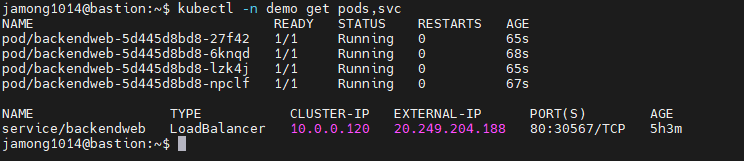 - 최종적으로 kustomize가 deploy.yaml을 읽어서 image: jamong1014.azurecr.io/backendweb:0e7ca40822d51f4630dedf5fdc0ccfdb62a0353e
