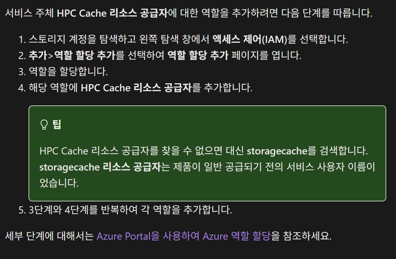 Lustre는 내부적으로 HPC Cache 리소스 공급자(Microsoft.StorageCache 리소스 프로바이더)를 통해 Blob Storage와 연동된다. 따라서 스토리지 계정에 Lustre가 붙으려면, HPC Cache 리소스 공급자 자체에 접근 권한을 주어야 한다.