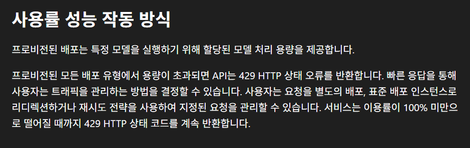 - 다만, 만약 요청이 확보된 PTU 용량을 초과하면 API가 HTTP 429(Too Many Requests) 상태를 반환하면서 요청 거절.