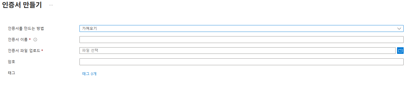 - jhjung-key2.vault.azure.net/secrets/jhjung-pfx의 jhjung-key2는 키 볼트 이름, jhjung-pfx는 인증서 이름