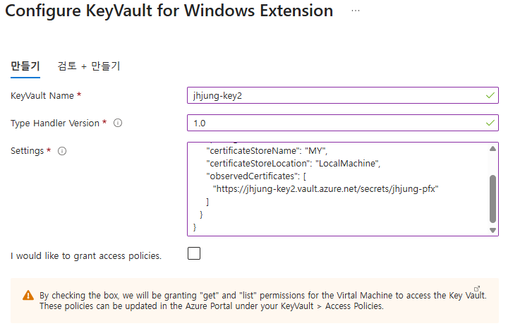 7. Azure VM의 확장 프로그램 + 애플리케이션 (KeyVaultForWindows 설치)